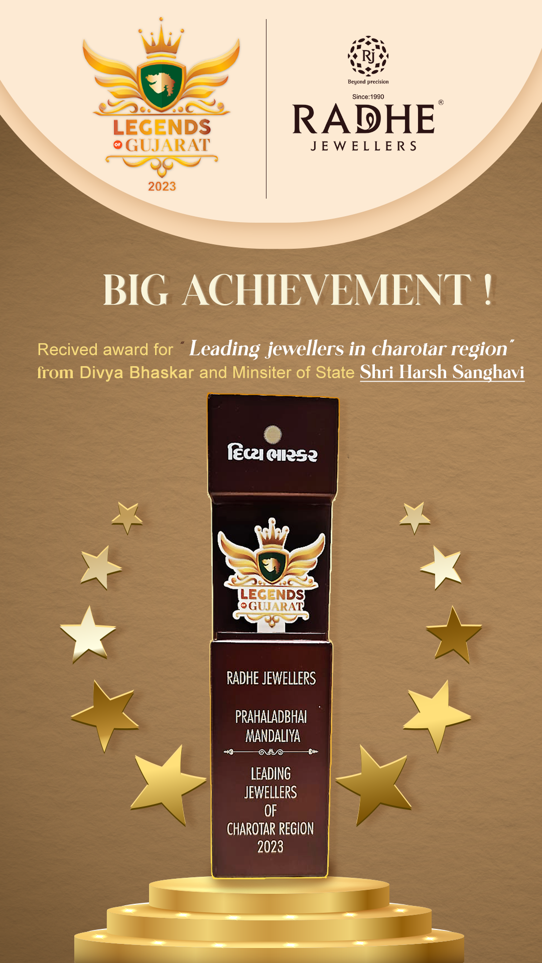 The Legends of Gujarat Award celebrates businesses that have demonstrated exceptional dedication, innovation, and service. Receiving this award is a testament to our enduring legacy of quality, craftsmanship, and customer satisfaction. At Radhe Jewellers Anand, we have always strived to set the highest standards in the jewelry industry, and this recognition reaffirms our position as a leader and a trusted name in the Charotar region.
